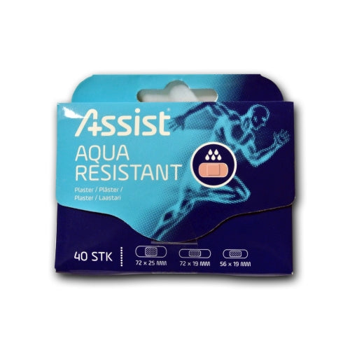 Vannfast plaster i praktisk flip flop-boks for enkel oppbevaring og tilgang. Pakken inneholder 40 plasterstrips som måler 79x19 mm, ideelt egnet for små sår og kutt.
