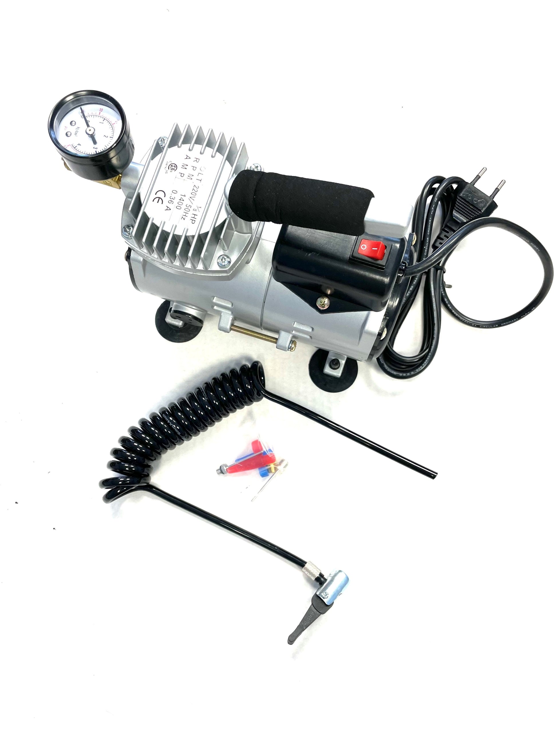 Elektrisk mini luftkompressor for effektiv pumping med både luftinn- og utfunksjon. Passer godt til rekvisita innen pumper der pålitelig og praktisk komprimering av luft er nødvendig.